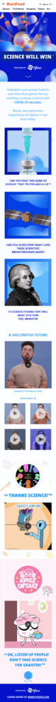 Landing page for Pfizer’s COVID-19 vaccine information campaign. Custom Ceros hub landing page that hosts Buzzfeed articles, and ‘Buzzcut’ videos that are featured in all social media channels.